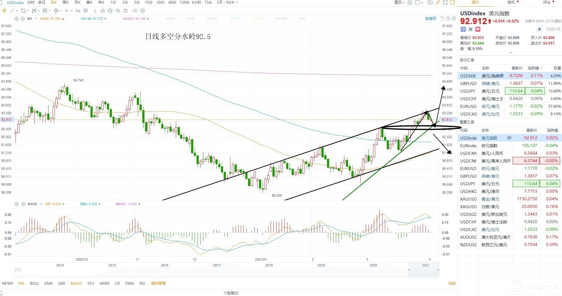 美元方面,非农数据预期利好支撑美元,但是昨日的下跌是美债的共振,因此今晚非农要关注美债的波动,技术层面来看,美元日线图形加速趋势线支撑92.5成为短线多空分水岭,这个价格不能跌破,如果跌破则回归上涨通道下沿91.4,但这里结构还是上升结构,所以不宜过分看空,不排除先跌候涨的可能性,注意如果跌破分水岭则打开向下空间,同时需要注意,是否共振美债的方向