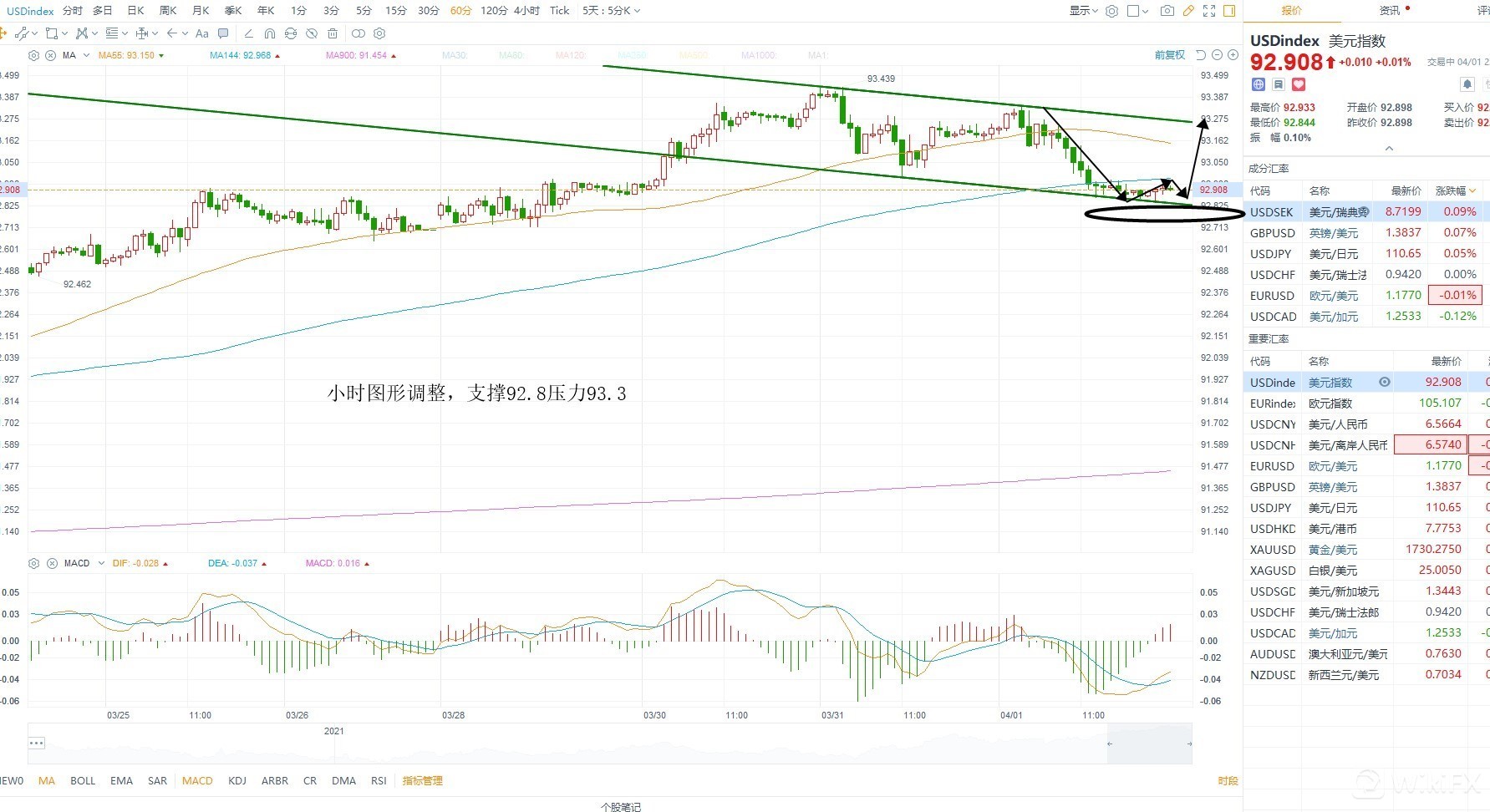 美元指数小时周期处于震荡调整之中,短线应到了调整通道的下轨,因此要注意是否跌破,如果这里跌破则会出现加速的情况,日内重要支撑92.8上方压力93.3,若数据利好美元,推动价格走高,突破93.3则重回强势上涨区域
