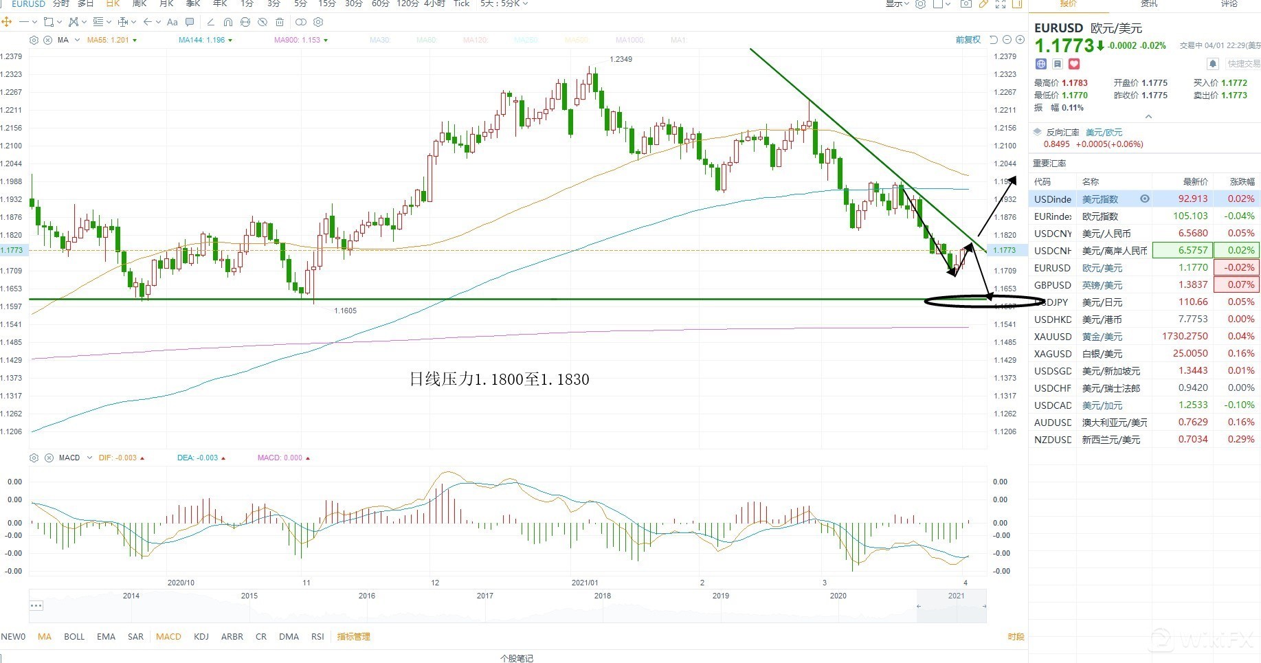 欧美日线图形下降趋势线压力在1.1800至1.1830区间,如果要反转向上则必须站上此区间,形成突破,否则谨防冲高回落的风险,下方中枢支撑1.1600,因此中期反转的点大概率要靠近1.1600至1.1630区间测试之后才有可能进入真正的反弹阶段
