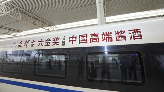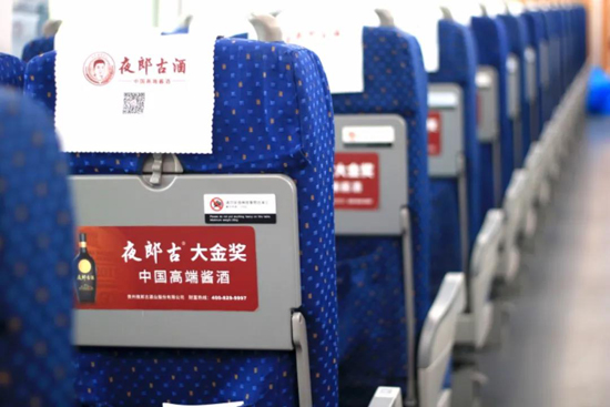 夜郎古列车车身“夜郎古·大金奖 中国高端酱酒”几个字格外耀眼。进入车内,可以看到每一个完美展示的空间,列车的各个环节都能让每一位乘客感受到夜郎古酒的品牌力。让D1753号列车成为夜郎古酒的专属移动名片,将夜郎古酒的品牌理念以高铁的速度向外传播。