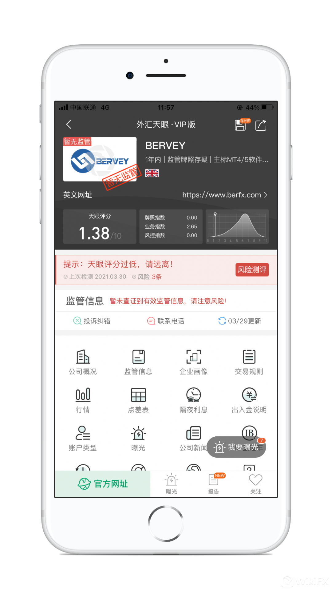 在外汇天眼上查询可知,BERVRY天眼评分1.38分,当前未查证到任何实际有效监管。在曝光台中,已经出现了多则投诉其诈骗、无法出金的曝光。可见,不止高先生一个人着了Bervey的陷阱。