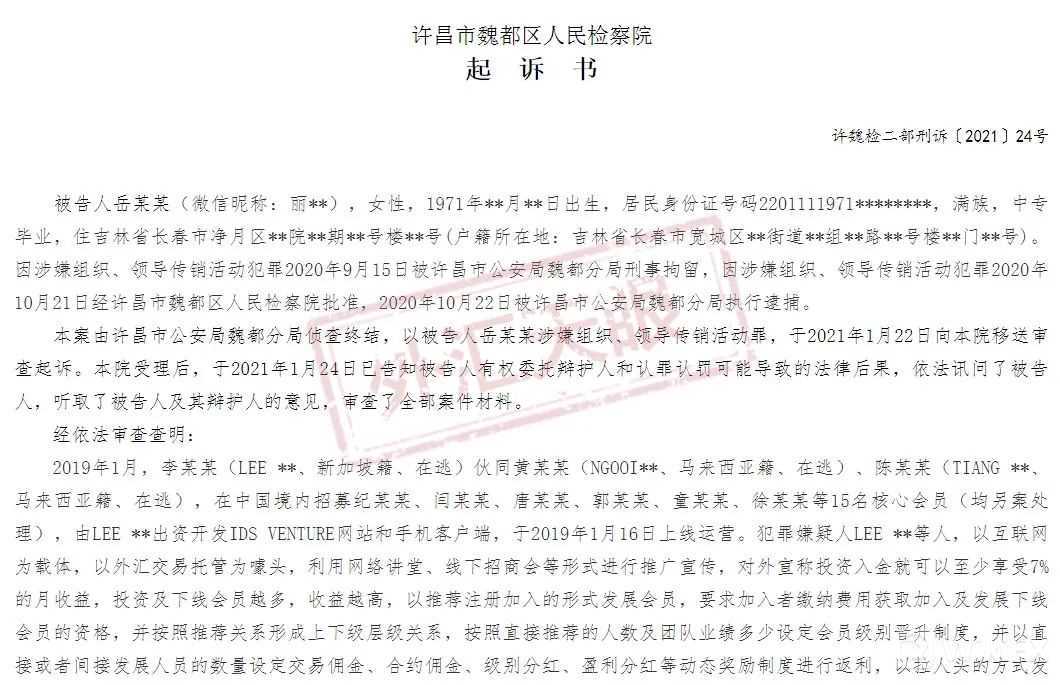 近日许昌市魏都区人民检察院公布了一则起诉书,起诉黑平台IDS的头目之一岳某某。