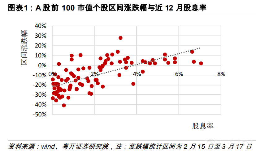 粤开证券统计了A股前100市值个股自2月15日至3月17日的涨跌幅与近12个月股息率的关系。我们看到,图中虚线向右上方倾斜,证明股息率与涨跌幅之间存在正相关。也就是说,股息率高的个股往往区间涨跌幅也较为可观。