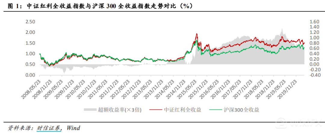 财信证券将代表高股息率个股的中证红利全收益指数(H00922.CSI,下称“中证红利”)与沪深300全收益指数(H00300.CSI,下称“中证300”)做了叠加对比。结果发现,自2015年以来,中证红利开始显著跑赢沪深300。根据研究发现,高股息策略在震荡市或熊市中存在明显的超额收益,而在牛市行情中则表现较弱。自2015年6月市场调整以来,过去的六年市场始终处于震荡市或结构性牛市中,因此高股息策略也得以施展拳脚。