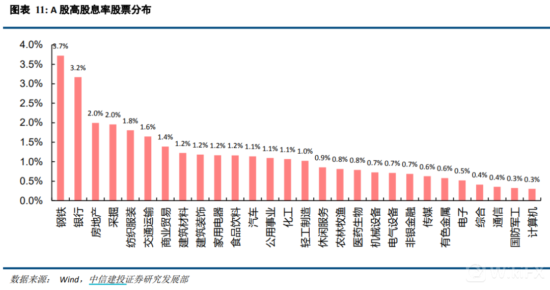 笔者认为,对市场敏感度较高的投资者不妨从行业入手。哪些行业集中的高股息率股票更多呢?我们可以发现,下图中钢铁、银行、房地产名列前茅。