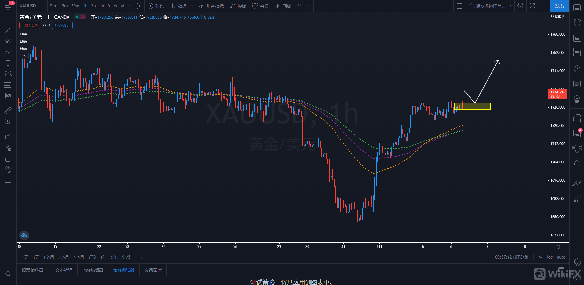 策略解析:黄金在之前小时级别大型看涨蝙蝠模式完成,价格继续强势上行,后市反弹或将延续,逢低买入为主。日内关注价格再次回踩1730-1727需求区的机会,可择机逢低买入黄金,上看目标1748一线附近。