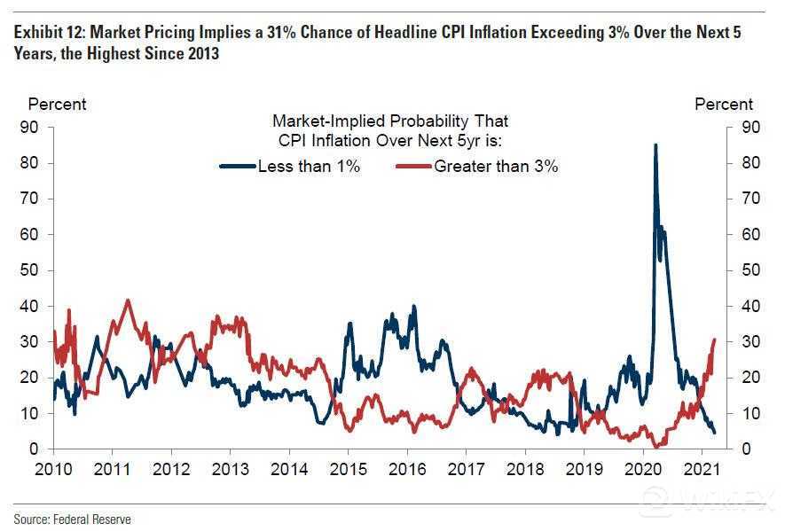 在3月非农强劲数据发布后,通胀问题再度成为市场焦点。高盛认为美国通胀“失控”的概率不大,未来5年CPI超过3%的概率只有31%。