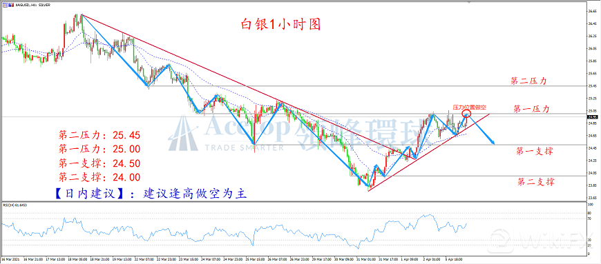 白银1小时图上,多头上周突破下行趋势线压力24.00位置,短暂整固后上行至25.00附近,目前在高位横盘整理。从均线上看,MA20和MA60金叉上行,多头运行良好;但从RSI技术指标上看,目前指标数据处于高位,有调整修正的趋势;由于经历连续大涨,日内调整回调的概率较大,操作上建议逢高做空的思路进行布局。