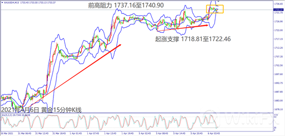 日级别线图,出现十字星反转信号,若冲不过1740美元,可能回测5日均线;15分钟K线,早上急涨后出现8根K线横向整理,若冲不过前高阻力,可能反转回测支撑。