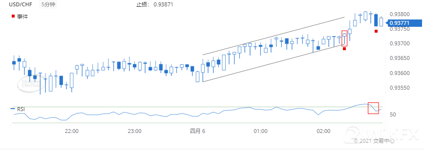 · RSI于2021 4月 06日(GMT时间02:50)出现下降且低于70,表明价格开始从超买恢复。