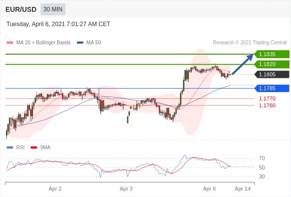 在 1.1785 之上,看涨,目标价位为 1.1820 ,然后为 1.1835 。