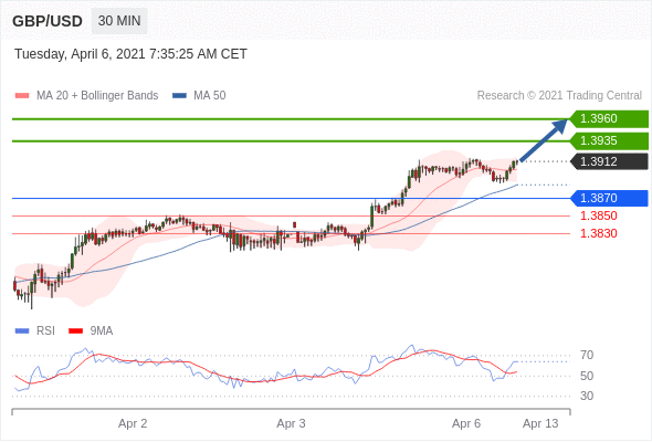 在 1.3870 之上,看涨,目标价位为 1.3935 ,然后为 1.3960 。