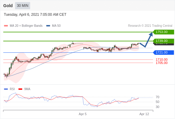 在 1721.00 之上,看涨,目标价位为 1739.00 ,然后为 1753.00 。