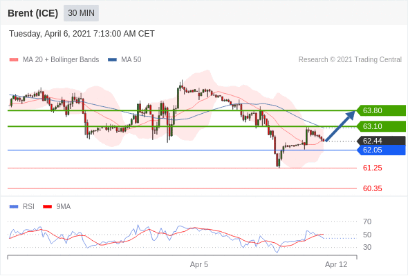 在 62.05 之上,看涨,目标价位为 63.10 ,然后为 63.80 。