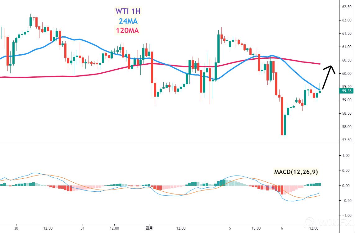 美油(WTI)一小时图 –24MA、120MA及MACD指标