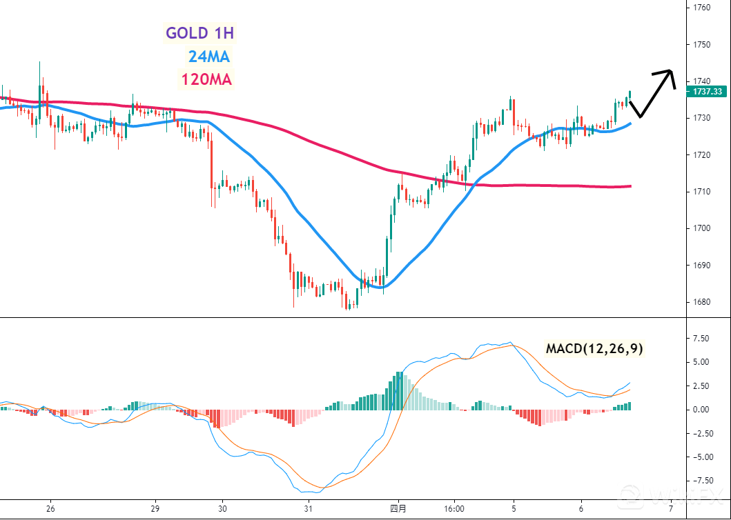 黄金(GOLD)一小时图 –24MA、120MA及MACD指标