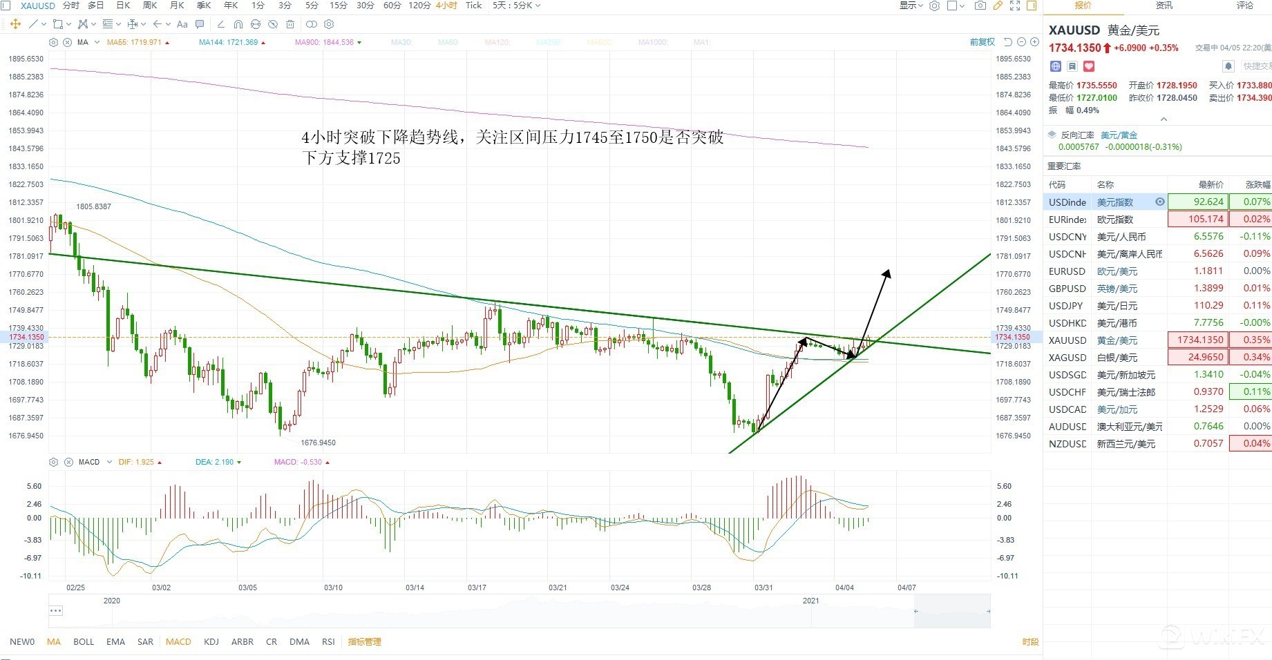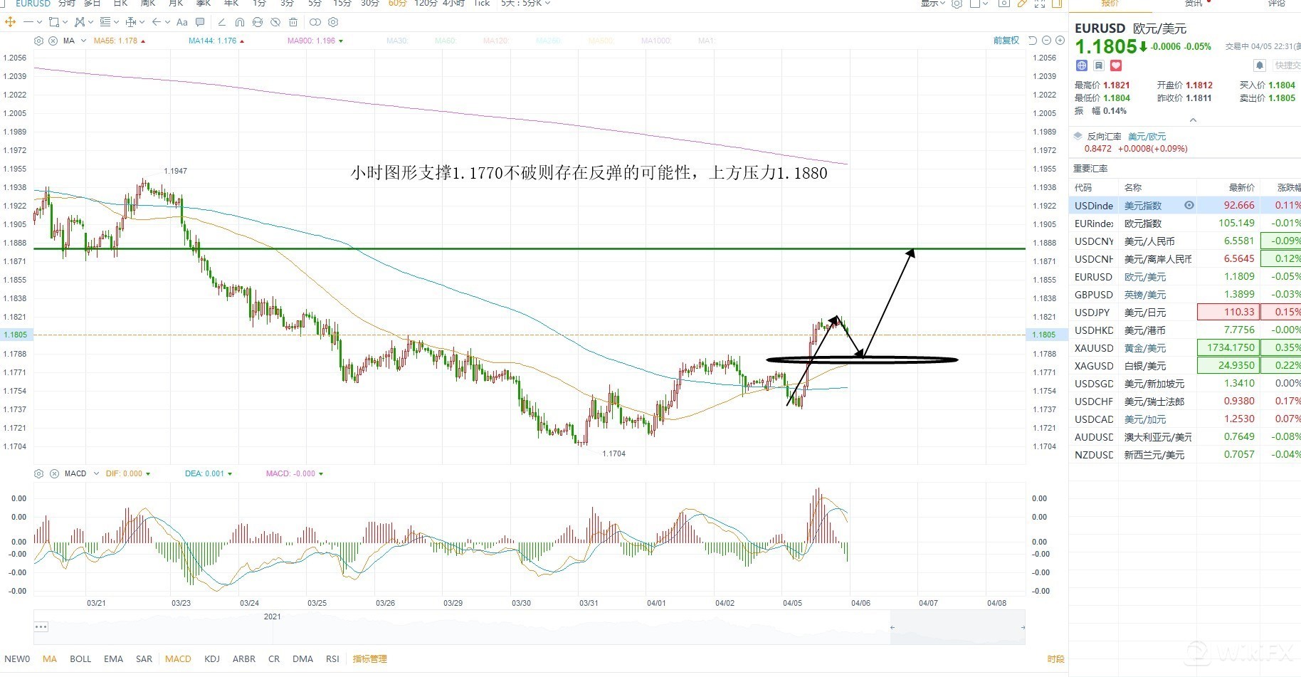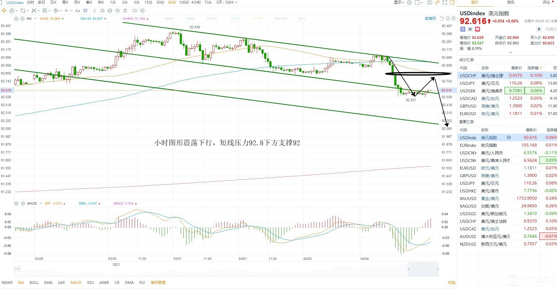 上周五非农数据超预期,但并未使得美元指数继续走高,反而冲高回落,同样美债收益率也是在近期高位附近盘整,基本面上因新一波疫情的威胁盖过了美国经济数据的反弹,美元应该有一波不错的调整机会,但大格局还是在箱体之内,所以无论上涨和下跌,给出趋势的概率不会很大,技术层面小时图形震荡下行,上方均线空头排列,短期压力在92.8附近,下方多空分水岭92,等待调整结束,日内偏空处理