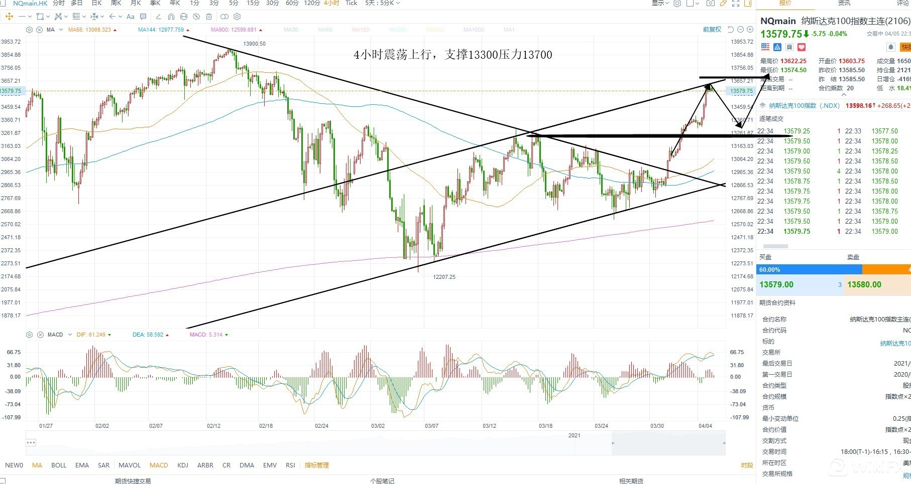 风险资产受经济复苏预期继续走高,且宽松的环境下,有望形成二次冲高,纳斯达克指数期货目前属于4小时级别的反弹,日内通道压力已经到位,如果突破则有测试前高的可能性,若盘中回踩支撑13300附近共振前期水平位置平台不破则保持震荡上行的格局不变,跌破则重回箱体