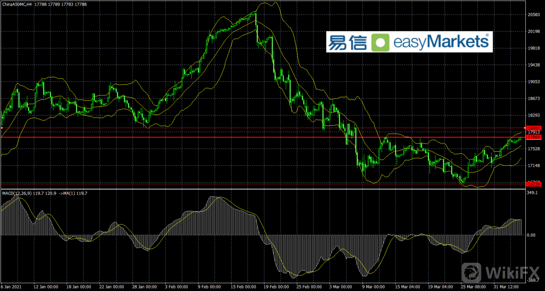 技术上看A50指数已经触及关键的压力位置17800点位,在上攻那么下方将形成一个突破走势形态,后面的压力是18000附近,短线支撑是17600附近。指标看布林线开口向上,而MACD高位徘徊,所以A50目前处于一个上涨格局中,交易策略逢低多为主,跌破支撑多头离场。