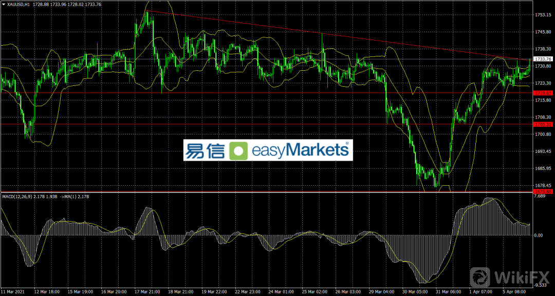 黄金短线触及压力1735美元附近,突破看1745美元附近,下方支撑是1722美元附近。指标看布林线开口加大,而MACD柱条横盘,似乎上涨依旧有动能。交易策略逢低多为主,关注布林线中轨支撑位置。