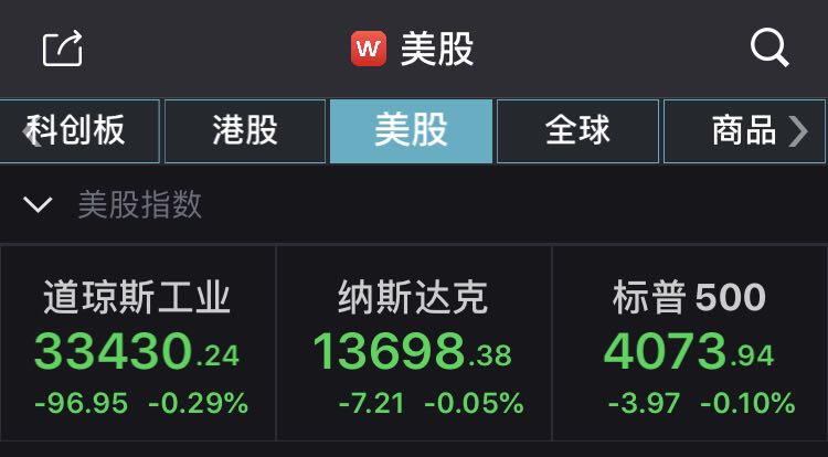 截至收盘,道琼斯工业指数跌96.95点,跌幅0.29%,报33430.24点;纳斯达克指数跌7.21点,跌幅0.05%,报13698.38点;标普500指数跌3.97点,跌幅0.10%,报4073.94点。