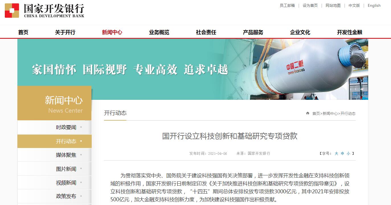 据国家开发银行官网6日消息,国开行设立科技创新和基础研究专项贷款,“十四五”期间总体安排投放专项贷款3000亿元,其中2021年安排投放500亿元,加大金融支持科技创新力度。