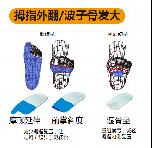 可活动型:使用跖骨垫重组横足弓,减轻拇趾内侧受压。