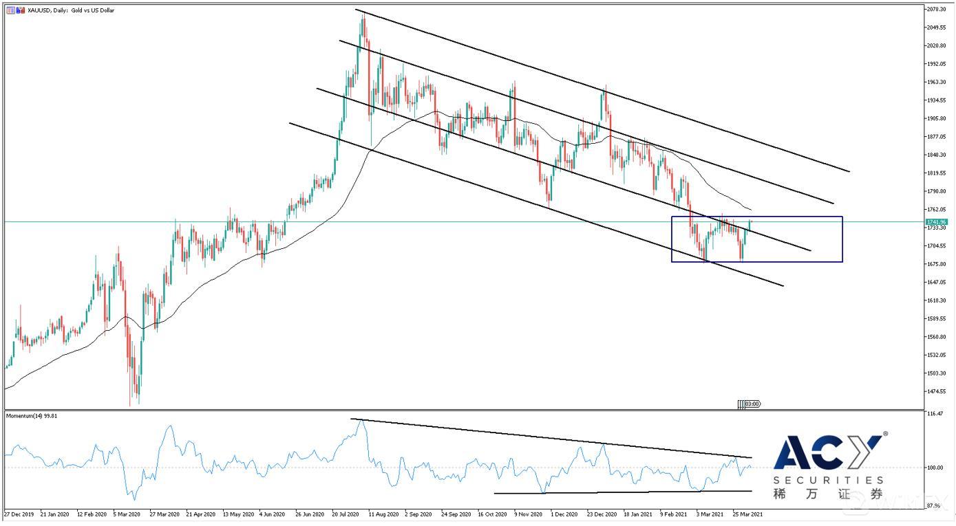 ACY稀万证券认为,美国经济改善并未受阻,将持续推高实际利率。10年期美债收益率仍将维持在1.7%附近,等到突破时机,短线下挫无法扭转收益率上涨局势。美元价值受到底部支撑,而金价也将相应承压。需要注意,美联储将于今日美市盘中公布货币政策会议纪要,关注政策方面的收紧计划。