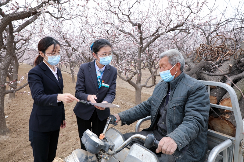 近日,农行河北邢台分行在辖内组建多支金融服务工作队,逐户上门对接资金需求,依托“惠农e贷+”产品组合,向农户提供一揽子金融服务,助力乡村振兴。截至3月末,该行涉农贷款余额211.9亿元,比年初增长16.8亿元。图为该行金融服务工作队在当地红杏种植基地向农户介绍国家惠农政策和金融产品。