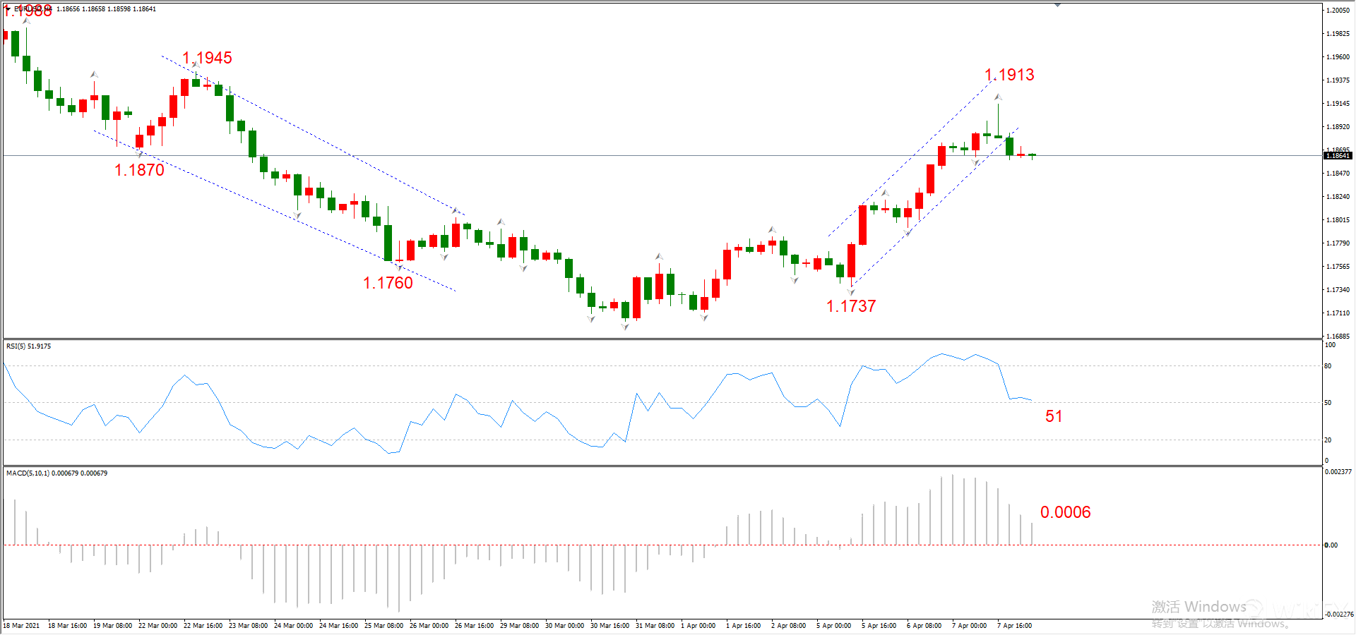 最新勾形:1.1737~1.1913~市价,回撤勾形