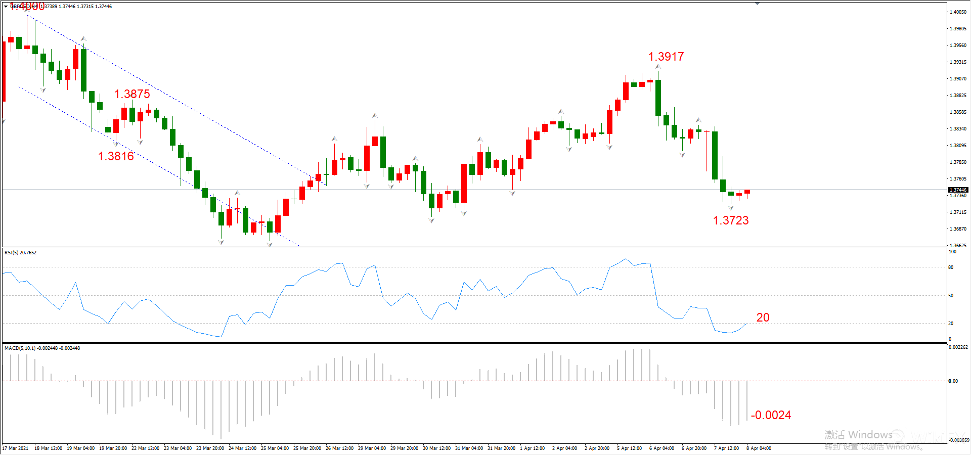 最新勾形1.3917~1.3723~市价,回撤勾形