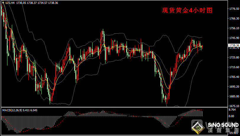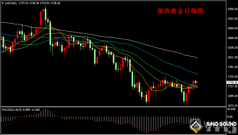 现货黄金日线图看,昨日金价在高位小幅回落,但金价5日均线仍然获得向上并穿越20日和30均线,显示金价短线多头存在上攻动能。同时,金价也存在前期密集区域阻力压制,目前金价高位1745附近为多空争夺主要关口。指标看,日线MACD指标负动能柱持续减小,但RSI指标维持在中线50位置走平。