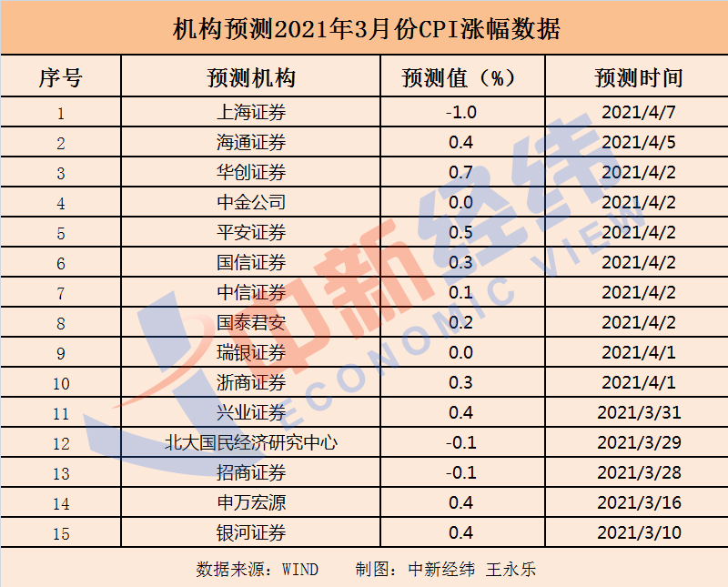 对于即将揭晓的3月份CPI数据,Wind数据显示,截至4月8日,15家机构对3月份CPI同比涨幅的预测均值为0.2%。华创证券、平安证券等10家机构给出正值预测,招商证券(600999,股吧)、上海证券等3家机构给出负值预测。其中,预测值最高为华创证券给出的0.7%,最低的为上海证券给出的-1.0%。