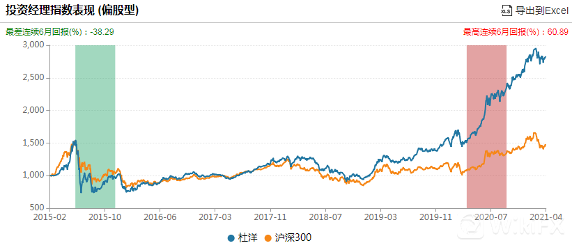根据wind数据,杜洋的基金经理指数总回报为182.77%,年化回报为18.44%,看起来虽然不是很高但是同期沪深300的年化收益仅为6.46%,也就说杜洋平均每年超越沪深300指数12个百分点左右。