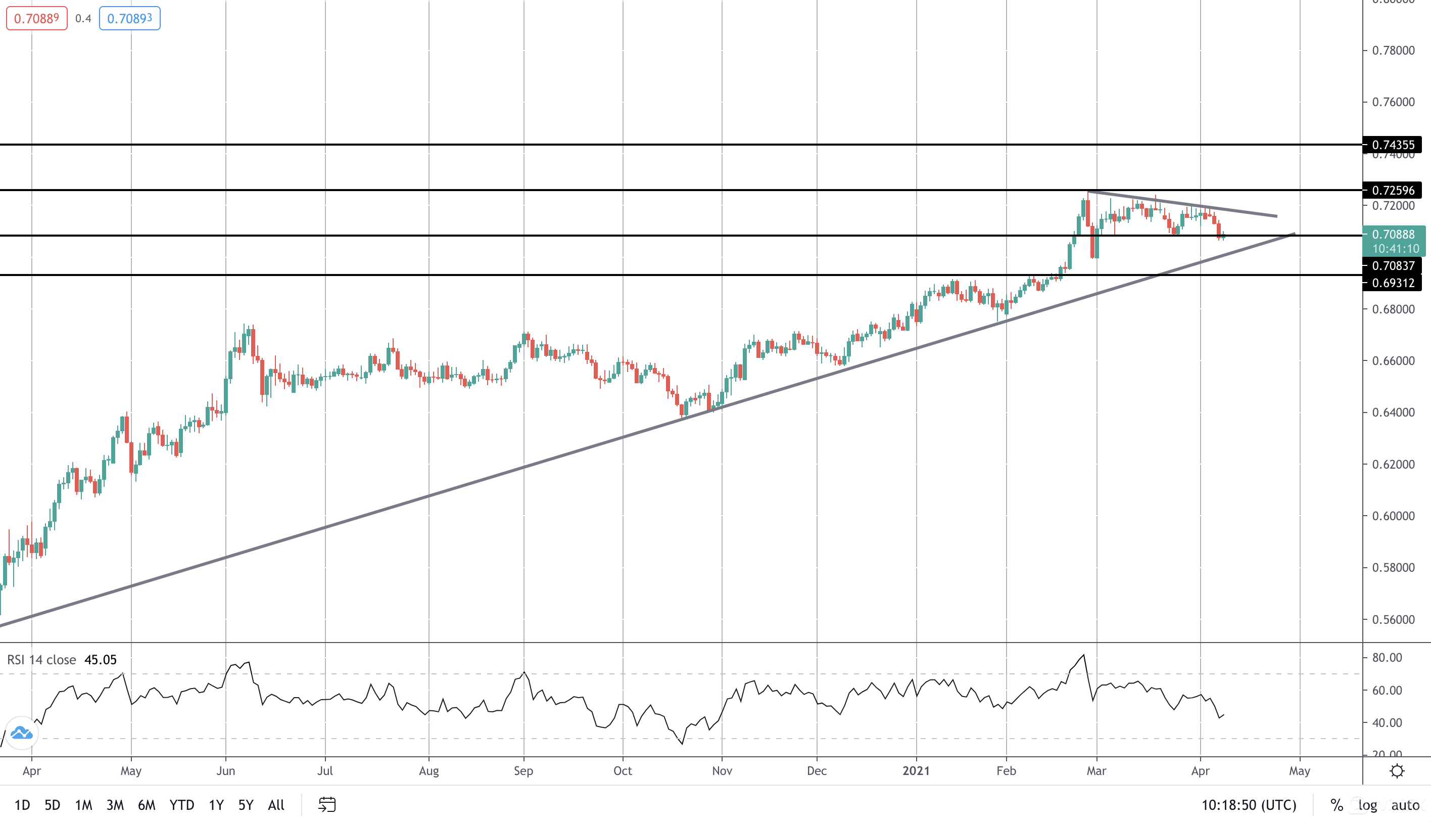 尽管澳洲联储重申了利率至少要维持到2024年的观点,但前景的上行风险可能会在短期内使AUD得到支撑。 同时,与疫苗接种成功和重新开放的乐观情绪有关的全球风险背景的改善意味着在短期内可能还会看到进一步的下行空间。