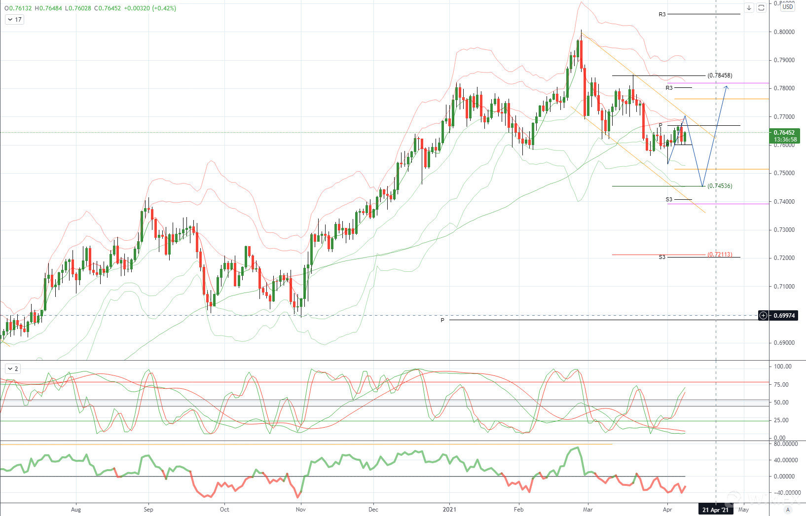 AUDUSD 日内偏差: 看跌低于.7700,目标位于.7453
