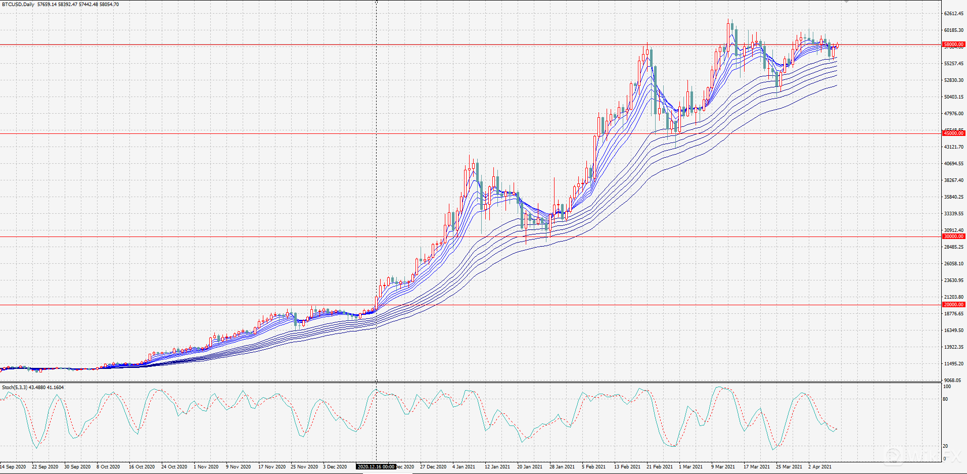 日线图级别,比特币自去年12月16日时隔三年再创新高,站上20000大关以来,波动和涨速均明显加大,短短三个月涨至三倍。顾比均线长期组保持支撑,长期上涨趋势没有改变。值得注意的是,高位滞涨,短期60000压力较大。