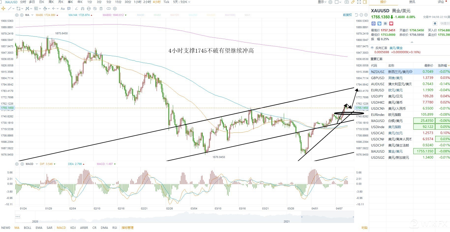 黄金昨日突破前期平台位置,站上1750,从基本面上来看,完全受益于美债收益率下行,所以节奏上应该有继续上冲的可能性,而ETF基金没有出现增持的动作,那么这个隐患对于黄金的多头而言是不利的,目前的上涨只能当作反弹来对待,短期角度日线级别1770成为重要压力,如果突破则有测试1800的可能性,下方平台支撑1745不能破位,否则重回箱体震荡