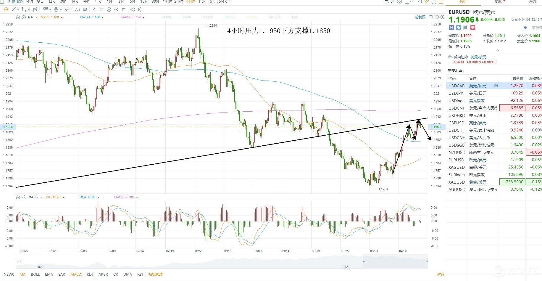 由于美元指数连续调整,推动欧美反弹,从基本面上来看,欧元是被动上涨,因经济数据弱于美元所以这里的调整是被动引发,那么要注意,技术层面日线周期再1.1950附近存在重要压力,如果测试压力失败,则有回落风险,短线追涨要注意风险,同步观察美元指数再支撑位置是否出现反弹,若美元结束下跌,则欧美再压力位置存在调整的风险,下方支撑1.1850