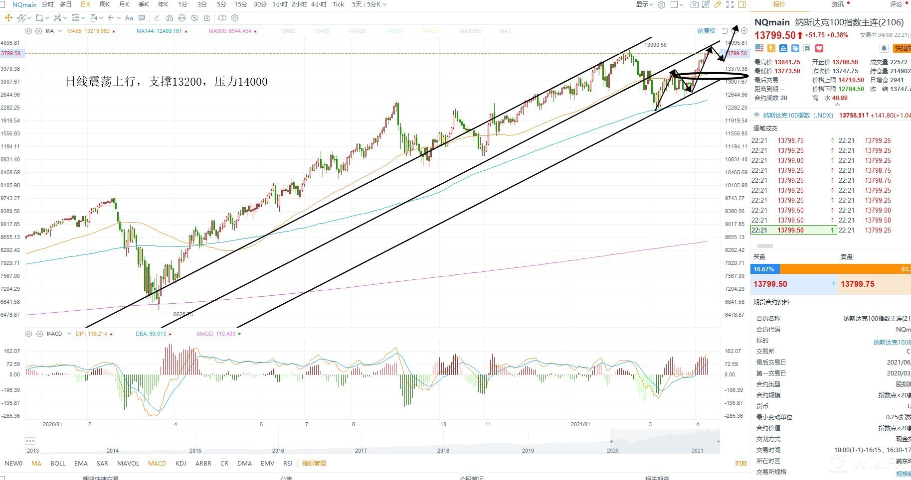 纳斯达克指数昨日再次上涨,因鲍威尔重申宽松预期,节奏上有继续上攻的动能,而且纳斯达克指数是三大指数中最后反弹的那么大概率会有一次新高背离的动作出现,注意前高位置附近的波动率会增加,因此不要过分追涨,谨防回落,日内压力14000附近观察是否遇阻回落,短线多头格局没有改变,下方支撑13200不破则继续维持震荡上行
