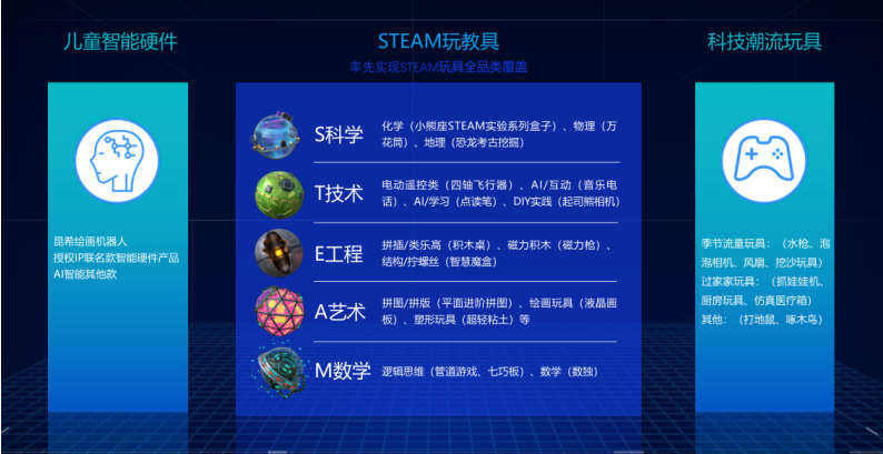 蓝宙现有玩具产品已遍布科学(S)、技术(T)、工程(E)、艺术(A)、数学(M)五大品类,包括儿童Steam启蒙玩具,如积木桌,智慧魔盒;儿童电动玩具,如电动积木;儿童编程玩具,如智能积木桌,DIY智能机器人;儿童智能硬件,如绘画机器人、早教机器人等。