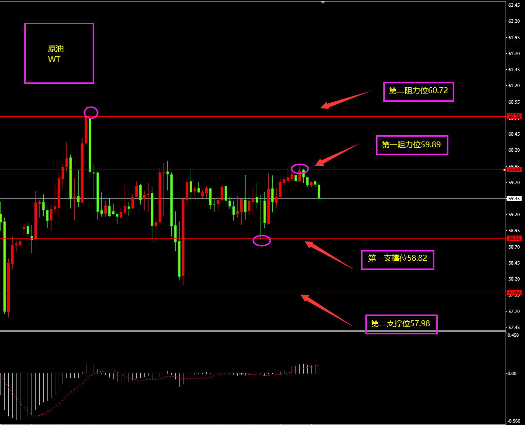 技术点评:原油昨日收小阳线,价格有所冲高,但实体部分较小,多头力度已大幅衰弱,而MACD位于0轴之下,空头占优,日内更多以震荡以及震荡下行为主?小时图原油期间震荡,看似MACD位于0轴之上,多头占优,实则能量不足,多头减弱,上方触顶有所回落,空头增强,日内更多以逢高看空为主。(注意暴跌的存在)