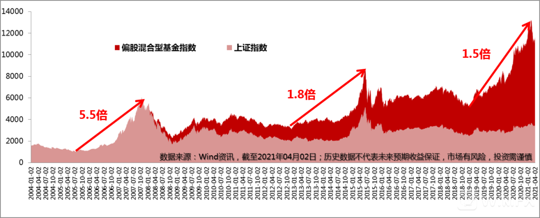 从以偏股混合型基金等权重编制的指数(885001.WI)的基日(2004年1月1日)开始取数,跑到今年一季度结束,我们可以看到17.25年时间里,偏股混合型基金指数相较同期上证综指创造过三次翻倍增长,分别是5.5倍、1.8倍和1.5倍——道路是曲折的,结果是可期的。