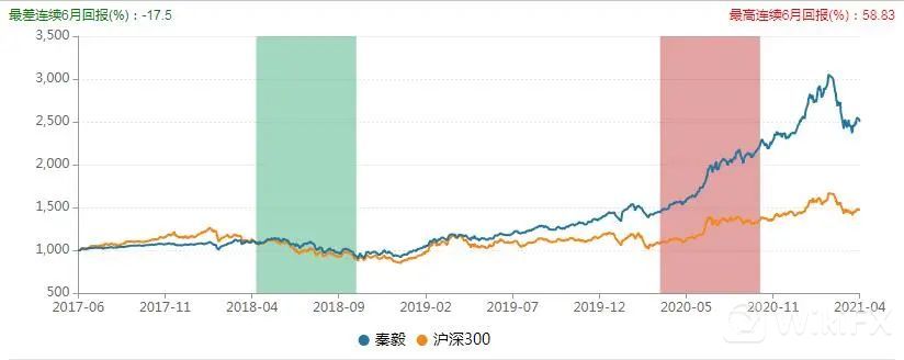 泓德基金一路良师为伴。秦毅是北京大学物理学本硕博连读,CFA,具有8年资管从业经验,近4年公募基金管理经验。曾任阳光资产管理公司行业研究员,2015年加入泓德基金至今,历任研究员、专户投资经理、研究部负责人,期间与泓德基金多位行业大佬同行学习,包括我们熟悉的同样具有险资背景的邬传雁和研究总监王克玉等,因为投资理念一致,“志同道合”一路熏陶下【长期主义、精选个股】的投资方法渐趋成熟。秦毅目前共管理5只公募基金,总规模229.88亿元(Wind,20210408)。他在wind的偏股拟合业绩指数近4年总回报149.99%,年化26.85%,同期沪深300总回报46.39%,年化10.40%。