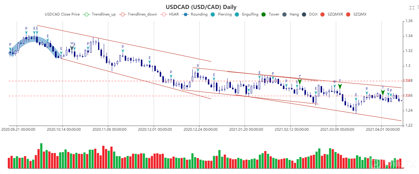 加拿大劳动力市场在向新冠病毒前的就业水平复苏方面继续取得实质性进展,3月份的新增就业岗位30.3万个。加元在兑其他货币上获益更多。尽管加元动能有所减弱,但在4月加拿大央行会议之前,并没有动摇加元的催化剂。然而利好加元之下,走势仍由美元主宰。日线图显示,美元兑加元自3月中旬低点开始,目前在1.2540-50附近呈盘整趋势,若持稳于目前水平有望进入底部整理,若向下创出新低则可能延续下行走势。重点关注1.2500-1.2700水平区间或为巩固1.2360的反弹走势。