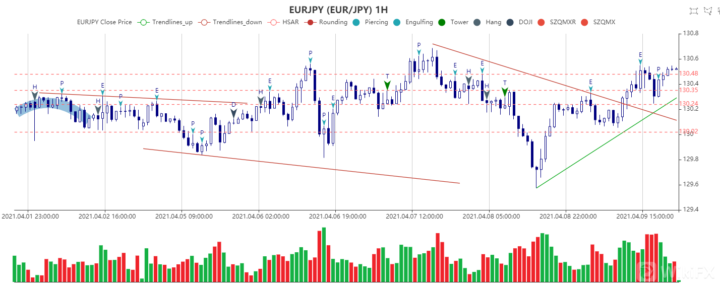小时图显示,欧元兑日元面临下一个阻力130.68(4月7日的高点),接下来是131.00。另一方面,下方支撑看向130.23(前日低点),接着位于130.05。