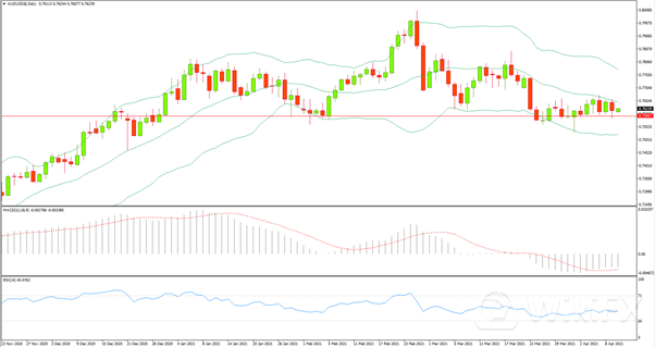 日线级别在布林带中轨下方不断震荡,RSI偏向空方,MACD下行动能趋弱,4小时级别收出一根吞没阳线,RSI处于上涨方向但还未上破50轴线,MACD处于多空博弈态势。今日空单在0.7652附近入场,止损在0.7673,止盈在0.7611。