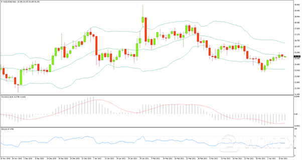 日线级别在布林带中轨之下收出一条阴线,RSI偏向空方,向上试探50轴线失败,MACD下行动能减弱。4小时级别沿布林带上轨单边上行一段时间后在中轨连续收出3颗十字星,价格可能发生反转,RSI还未下破50轴线,MACD上行动能减弱。今日空单建议在25.23附近入场,止损在25.6,止盈在24.5。