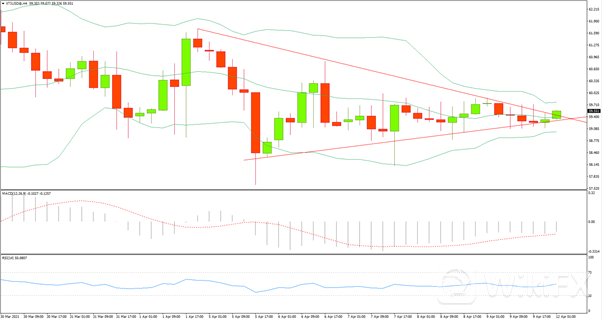 日线级别小幅收跌,RSI与MACD在过去半个月内均处于多空博弈态势,4小时级别布林带口逐渐收窄,RSI主语多空博弈态势,MACD下行动能减弱,价格整体处于对称三角形形态,似乎有向上突破的迹象。建议以观望为主,可以在回踩位置做多,入场位置在59.38,止损在59.08,止盈在60.17