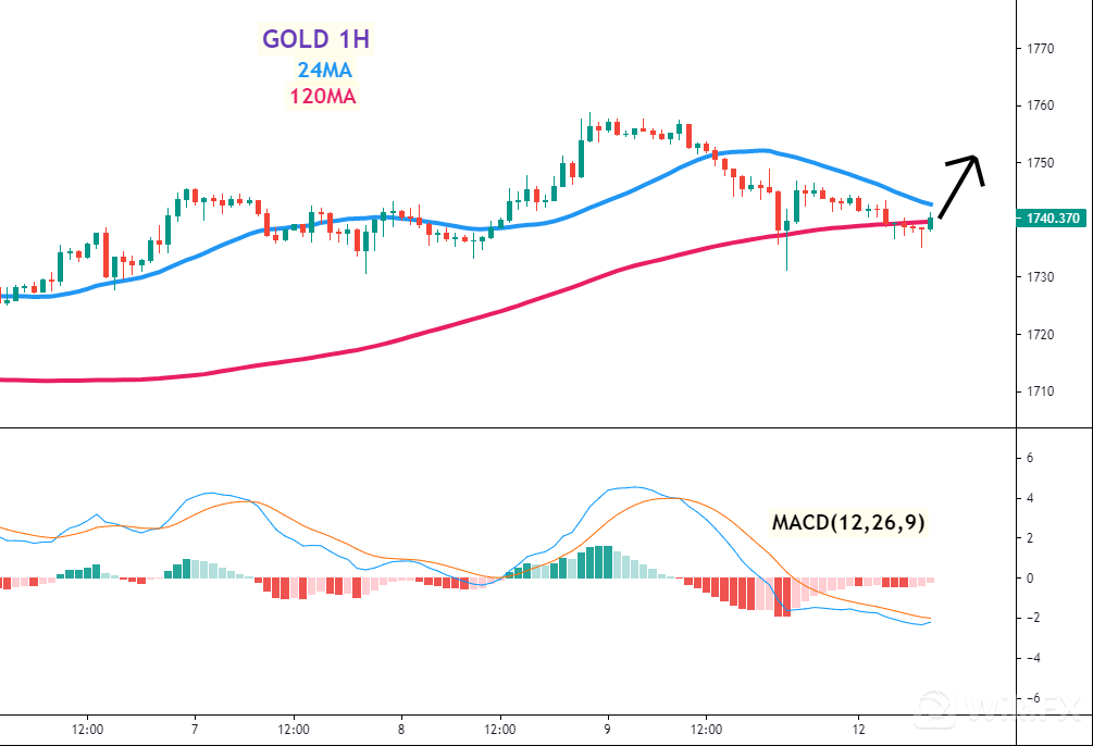 黄金(GOLD)一小时图 –24MA、120MA及MACD指标